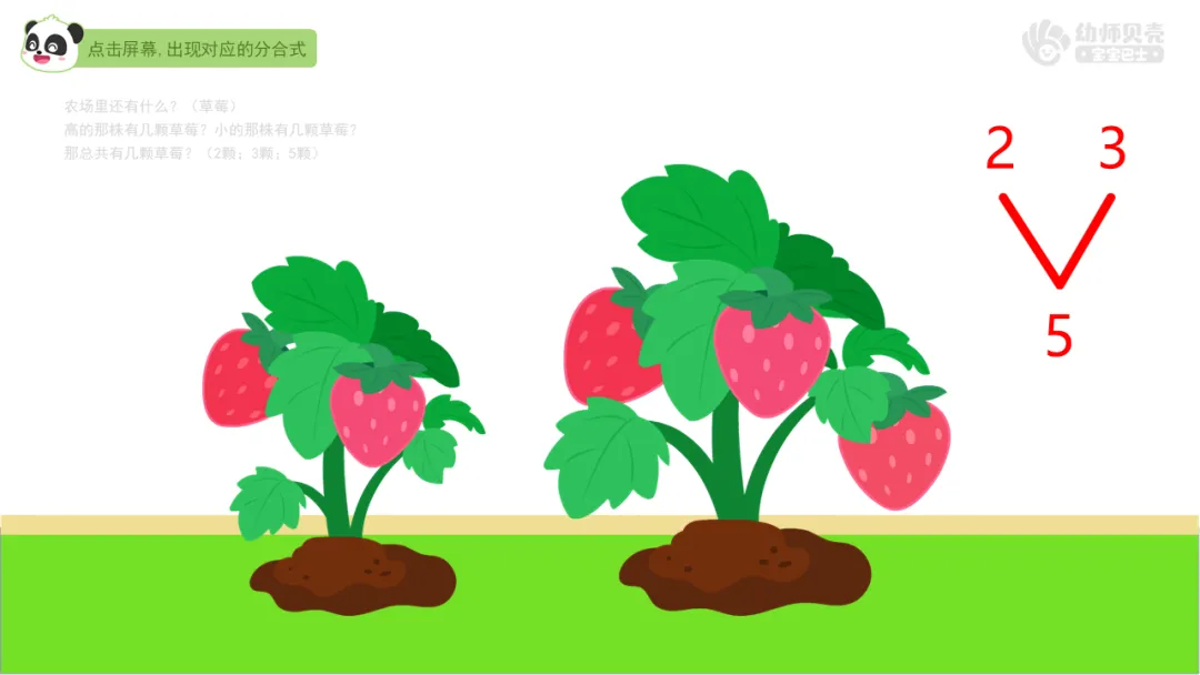 ——高的那株有几颗草莓?小的那株有几颗草莓?那总共有几颗草莓?(2颗;3颗;5颗)