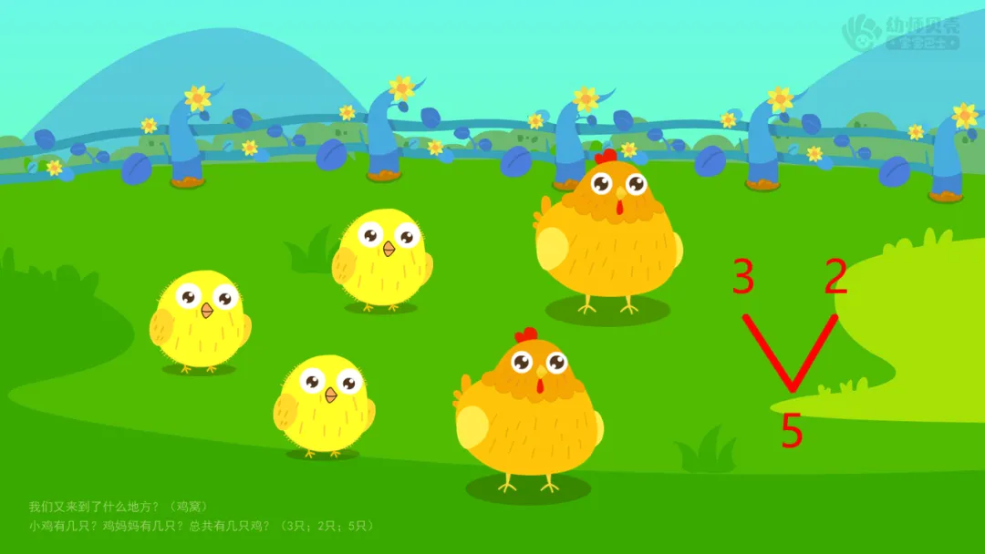 ——小鸡有几只?鸡妈妈有几只?总共有几只鸡?(3只;2只;5只)