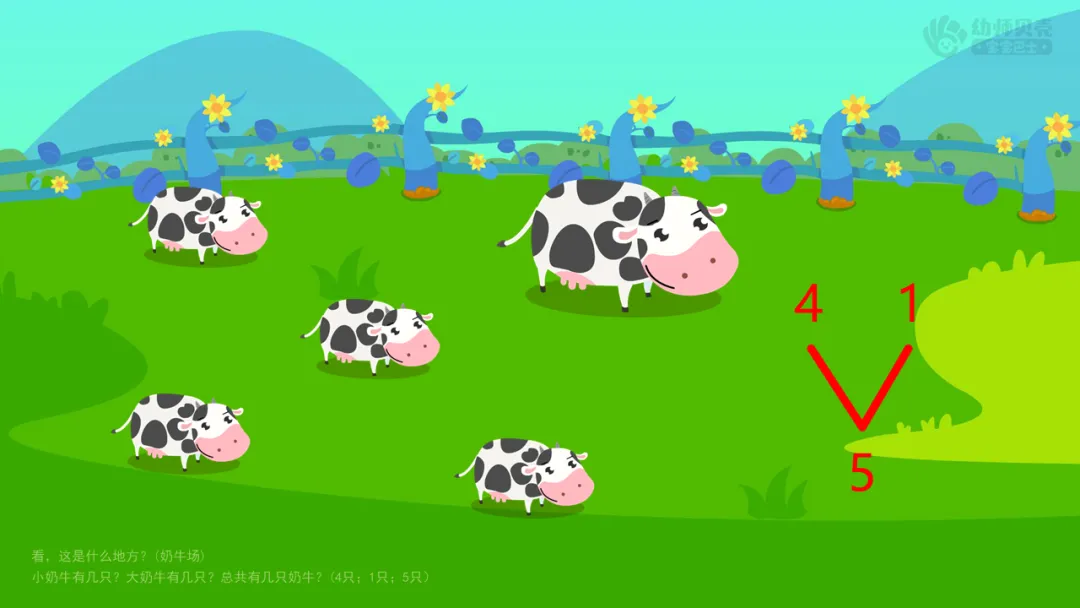 ——小奶牛有几只?大奶牛有几只?总共有几只奶牛?(4只;1只;5只)