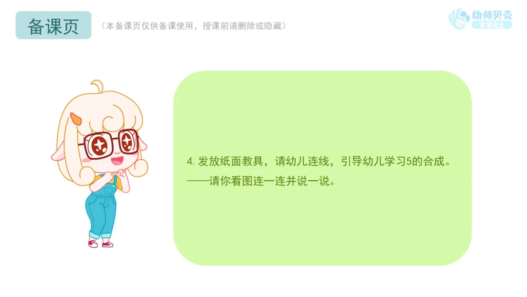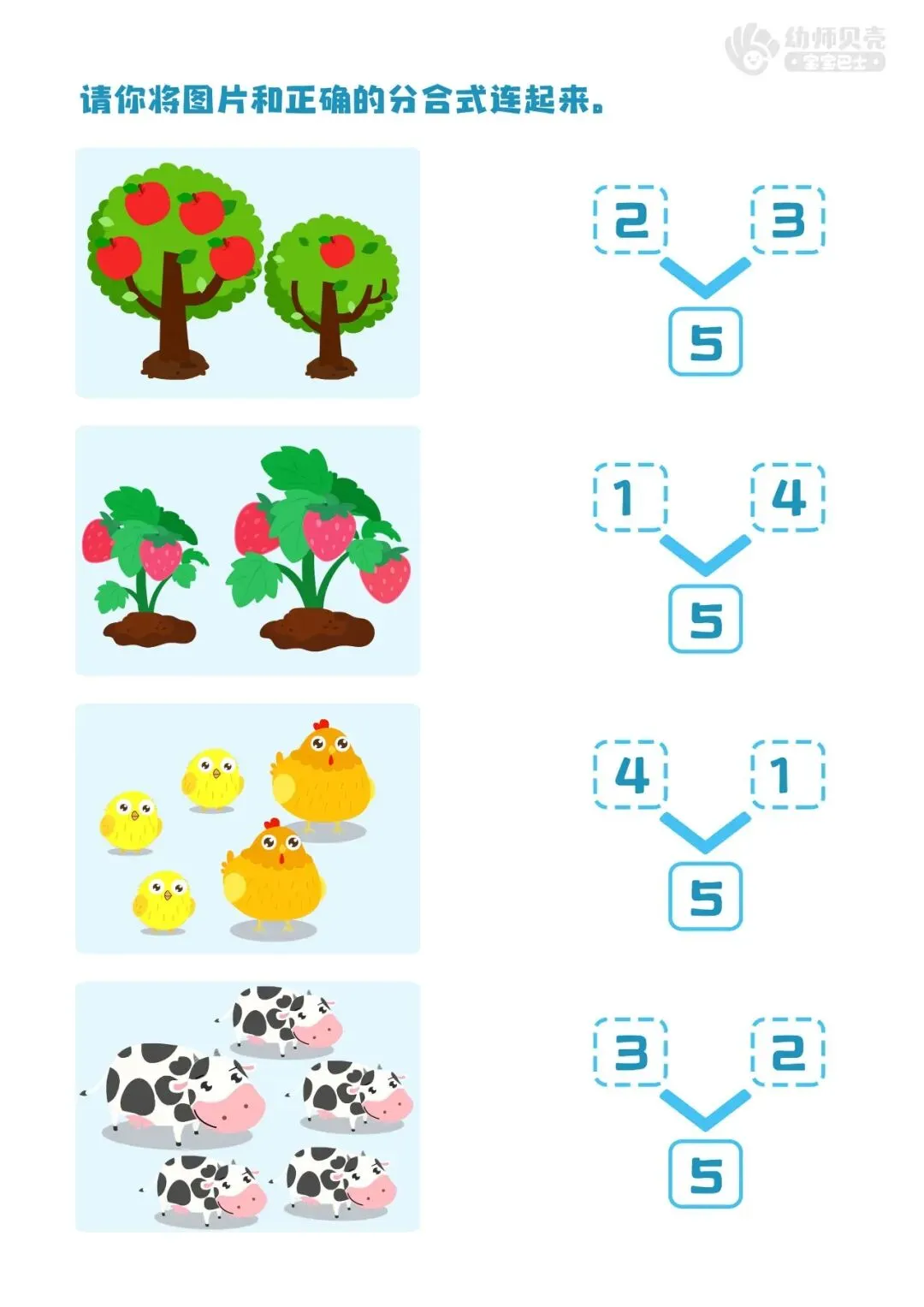 4.发放纸面教具,请幼儿连线,引导幼儿学习5的合成。