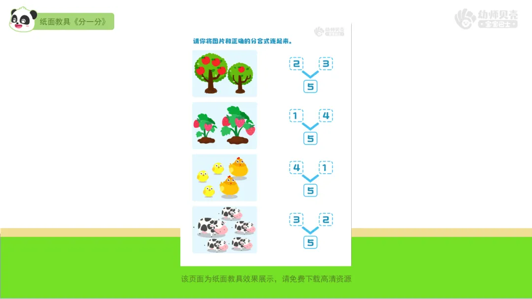 2.发放纸面教具《分一分》并操作课件,引导幼儿操作教具,了解5的分解。
