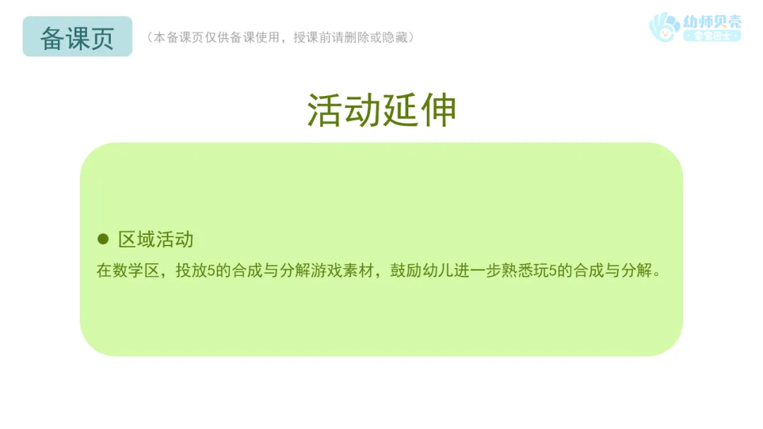 在数学区,投放5的合成与分解游戏素材,鼓励幼儿进一步熟悉玩5的合成与分解。