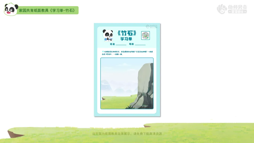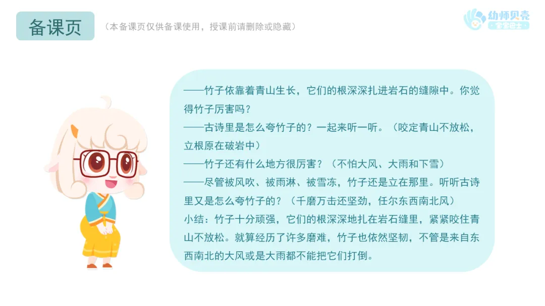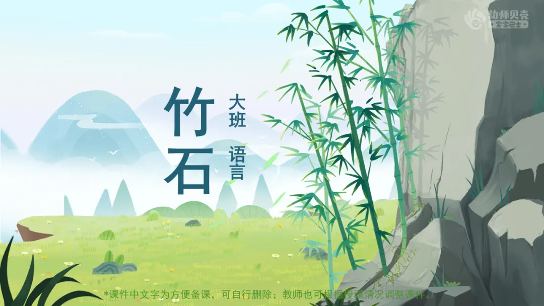 l播放古诗视频《竹石》并操作课件,鼓励幼儿根据画面猜测古诗内容,感知竹子坚韧顽强的品质并理解诗意。