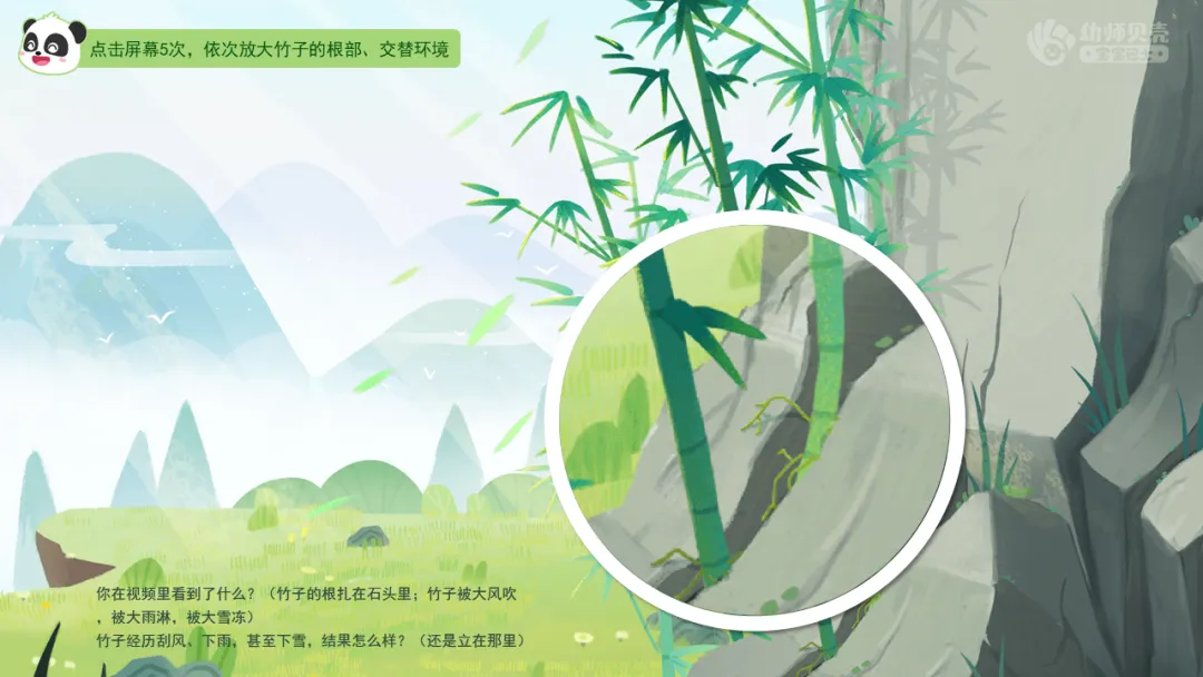 ——你在视频里看到了什么?(竹子的根扎在石头里;竹子被大风吹,被大雨淋,被大雪冻)