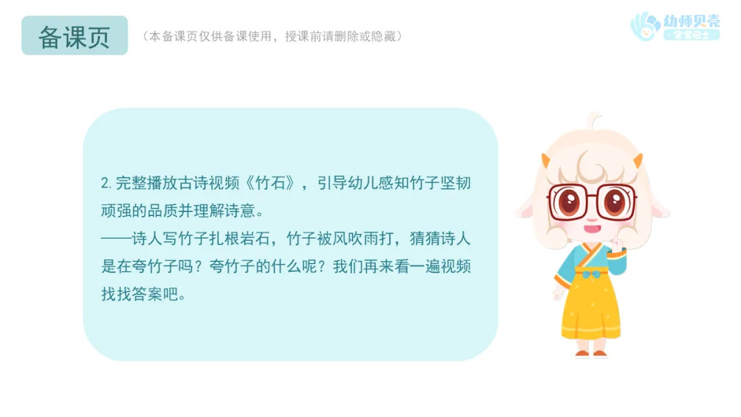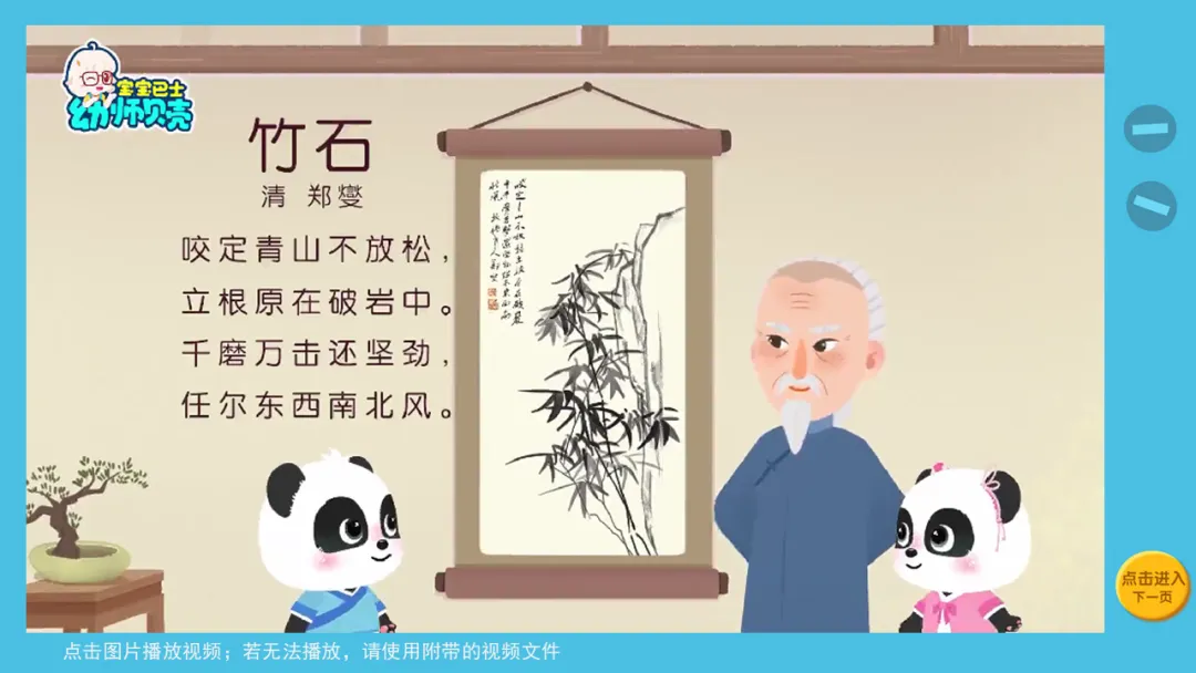 2.播放古诗视频《竹石》念唱版,鼓励幼儿表演并尝试诵读古诗,体验古诗表演的乐趣。