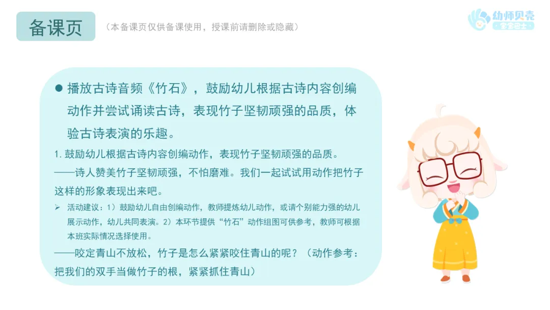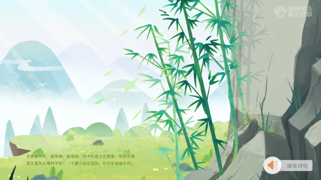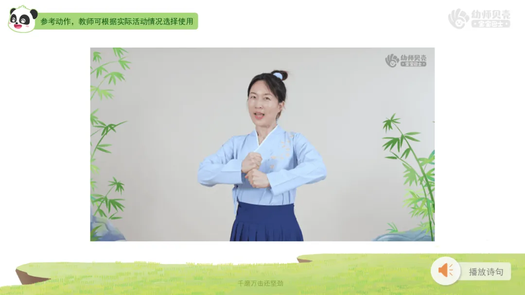l播放古诗音频《竹石》,鼓励幼儿根据古诗内容创编动作并尝试诵读古诗,表现竹子坚韧顽强的品质,体验古诗表演的乐趣。