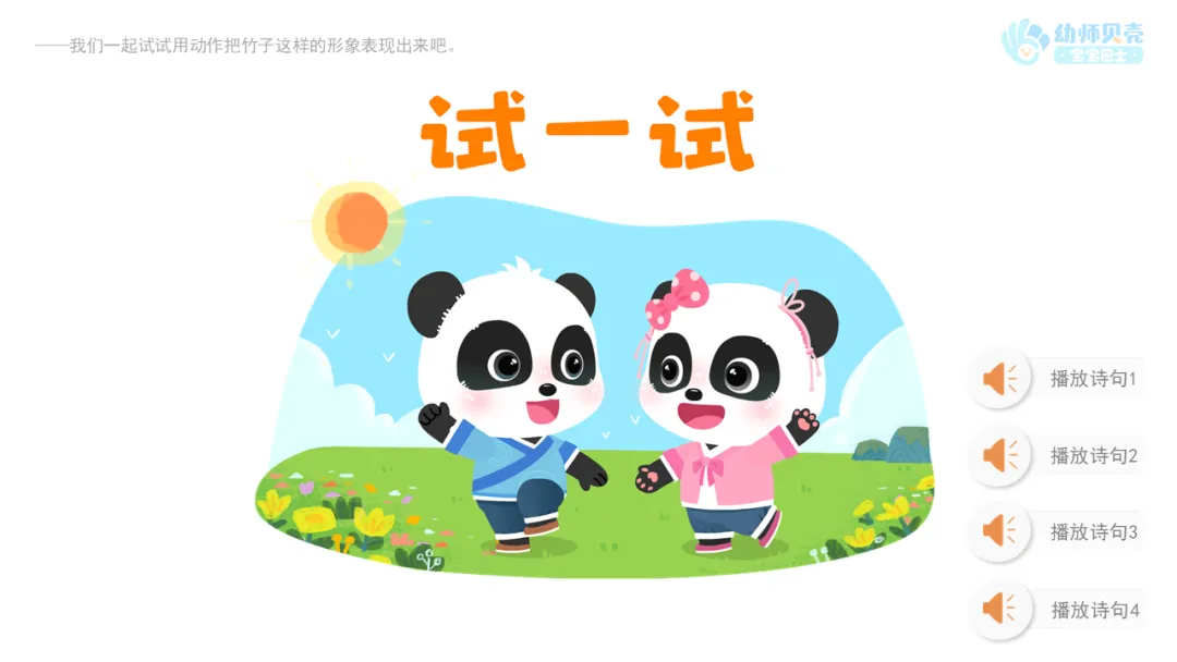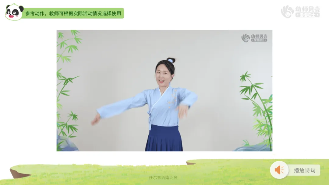 ——现在让我们跟着古诗视频,一起完整地表演吧。在表演时,小朋友们还可以用好听的声音跟着视频,念一念、唱一唱古诗。