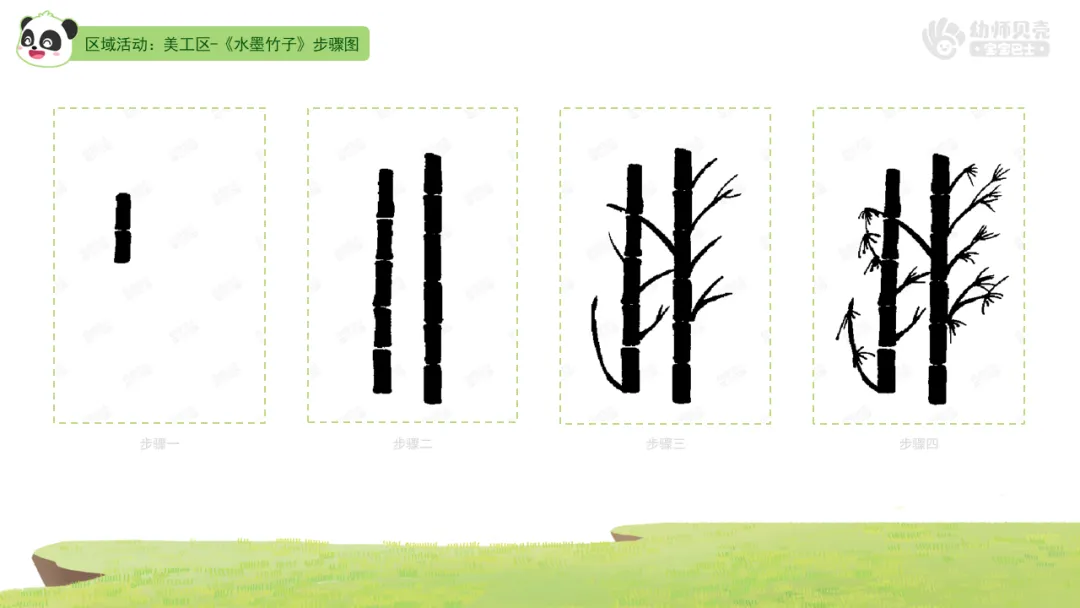 在美工区,投放竹子的照片、黑色双头马克笔和画纸,鼓励幼儿用马克笔的宽头画竹竿,尖头画竹叶,自由创作具有水墨风格的竹子。