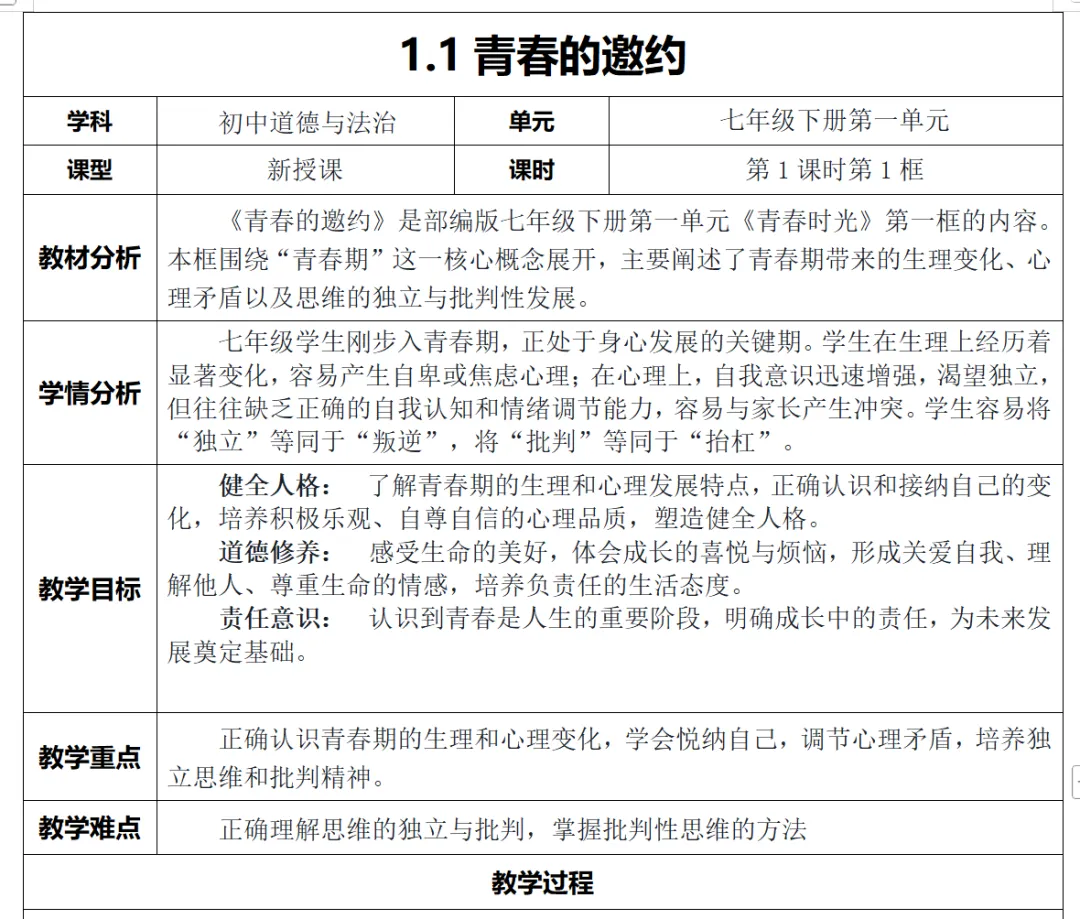 大家好呀~今天分享的是【26春】七下《1.1青春的邀约》的课件+教学设计。话不多说,详细请看以下内容。