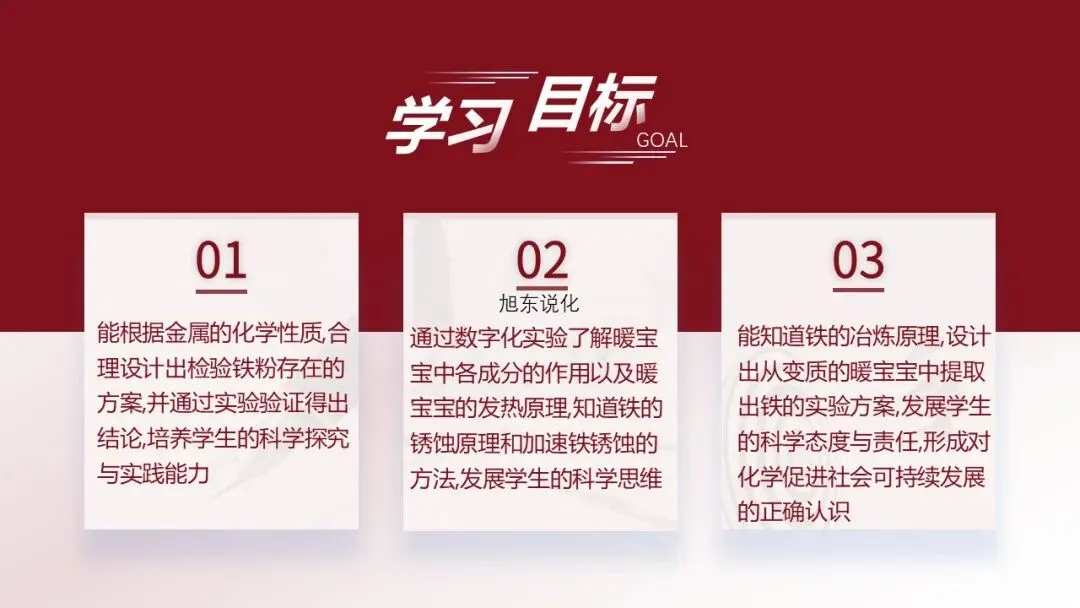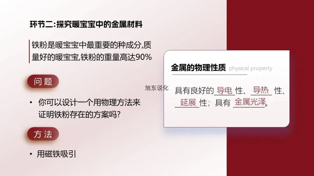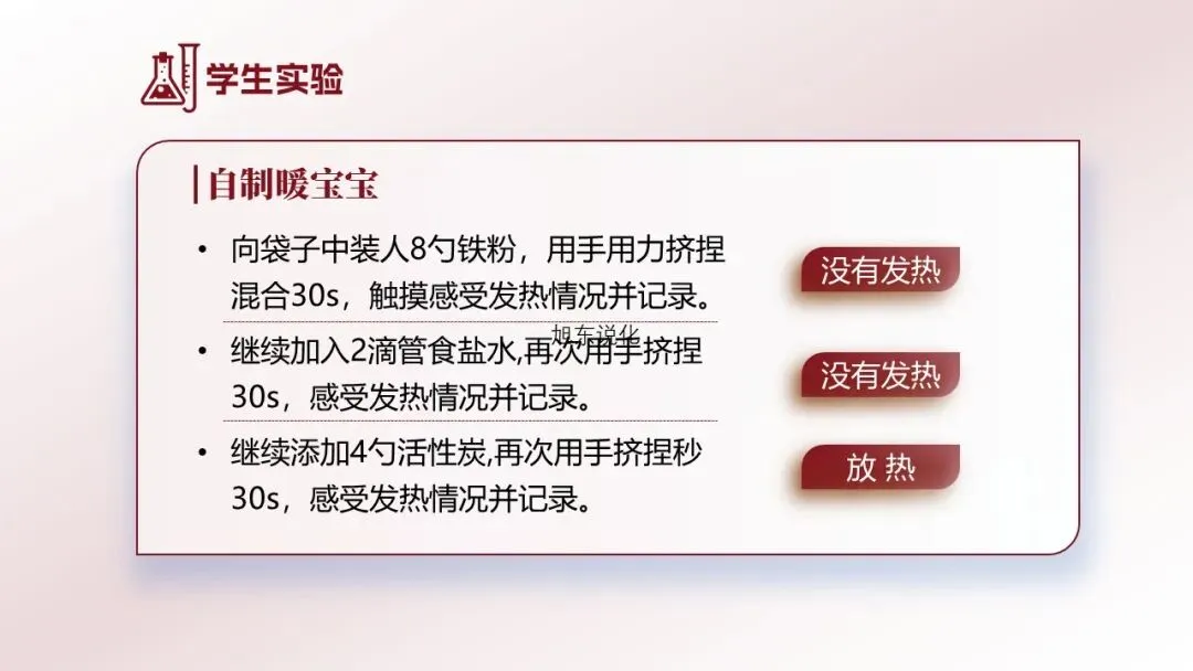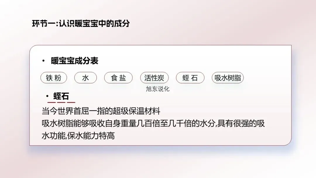 教学环节一:认识暖宝宝中的成分[资料卡1]暖宝宝成分表:铁粉、水、食盐、活性炭、蛭石、吸水树脂。