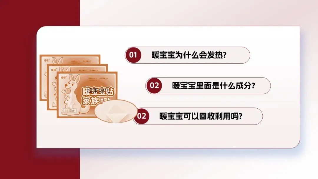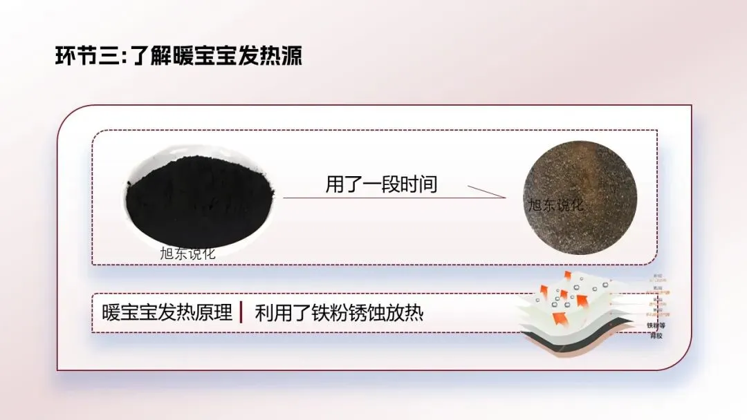[拆解成子任务]暖宝宝为什么会发热?里面是什么成分?暖宝宝可以回收利用吗?[过渡]那就让我们带着同学们的疑问走近暖宝宝。
