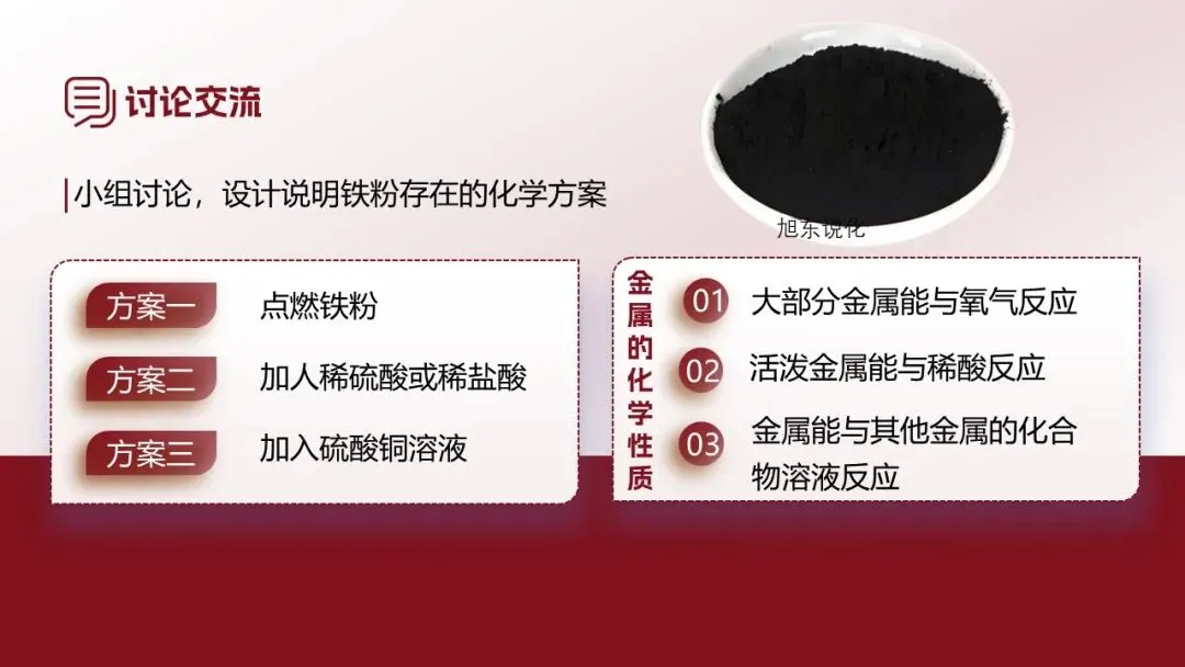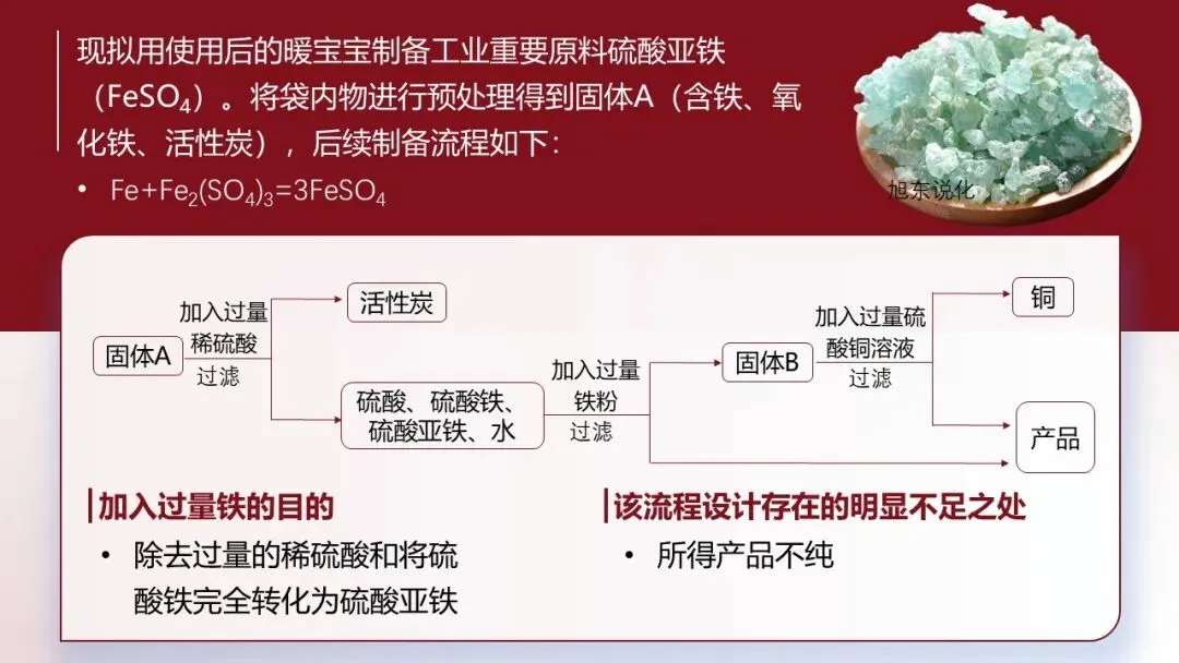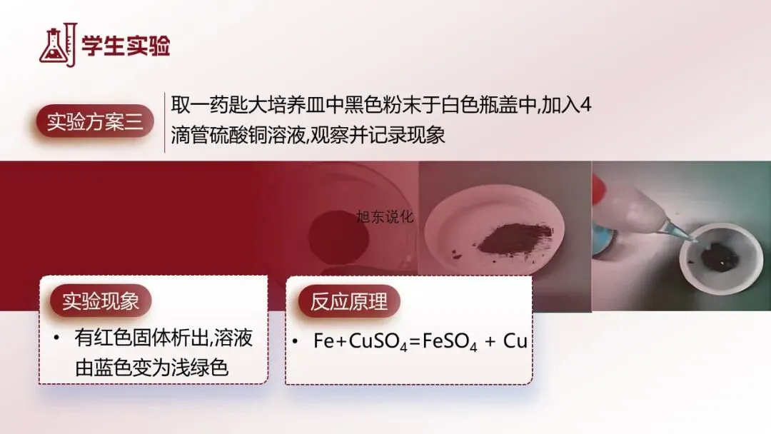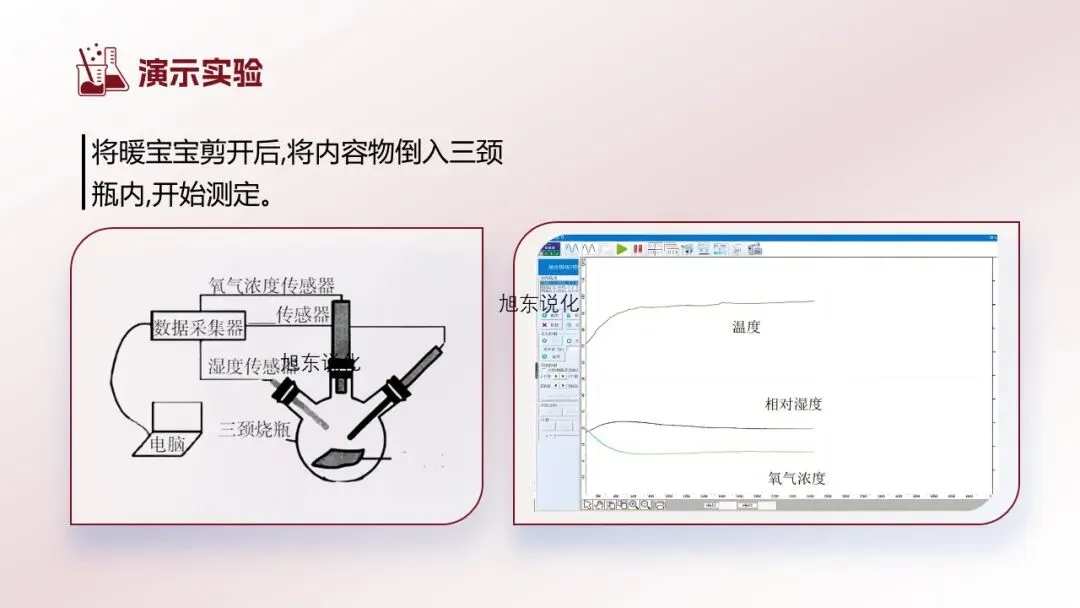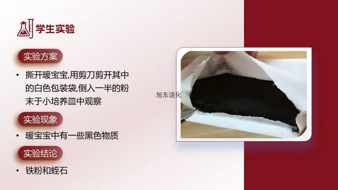 [学生实验1]撕开暖宝宝,用剪刀剪开其中的白色包装袋,倒入一半的粉末于小培养皿中,观察。[学生]观察到暖宝宝中有一些黑色物质。[教师追问]结合资料跟PPT上的图片,你觉得黑色物质是什么?