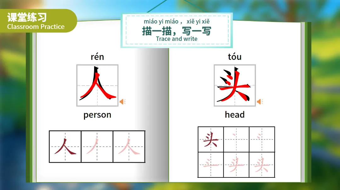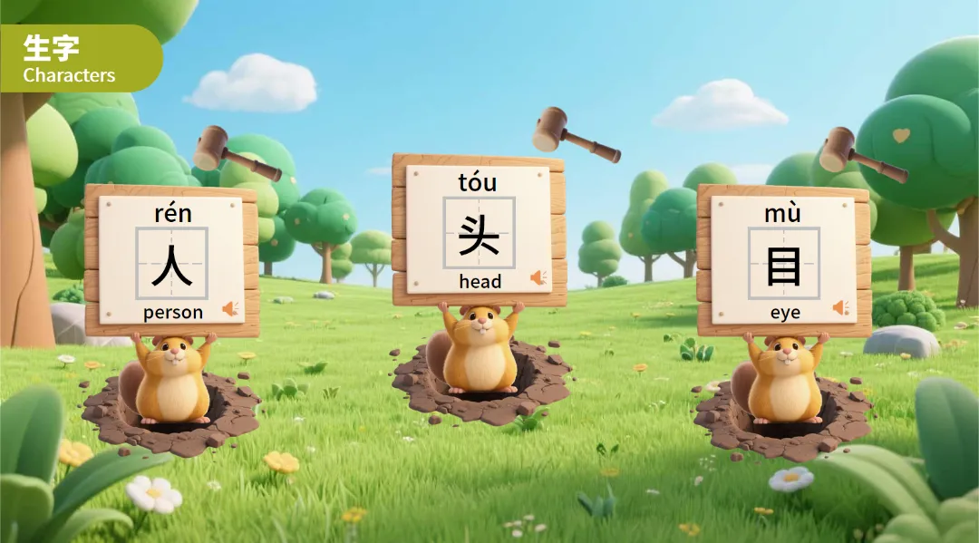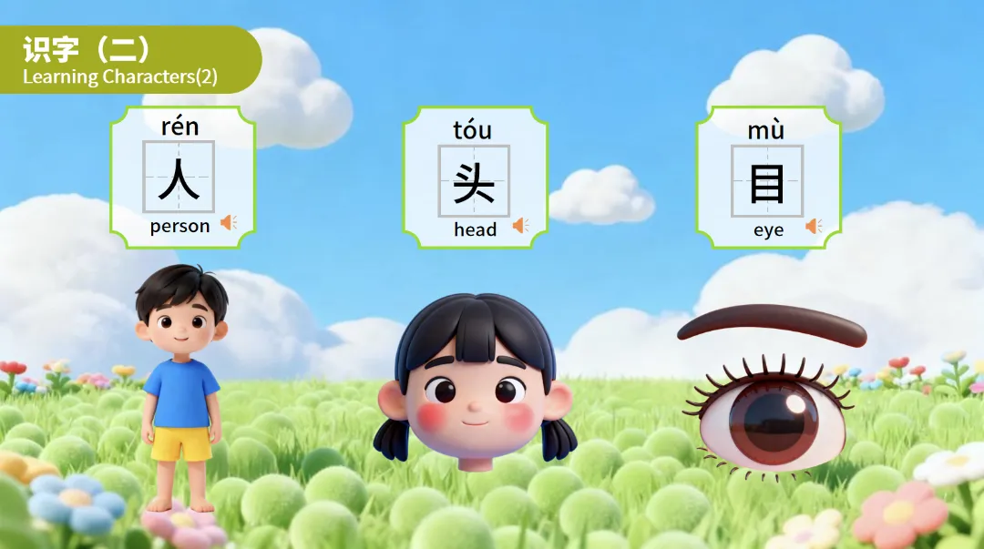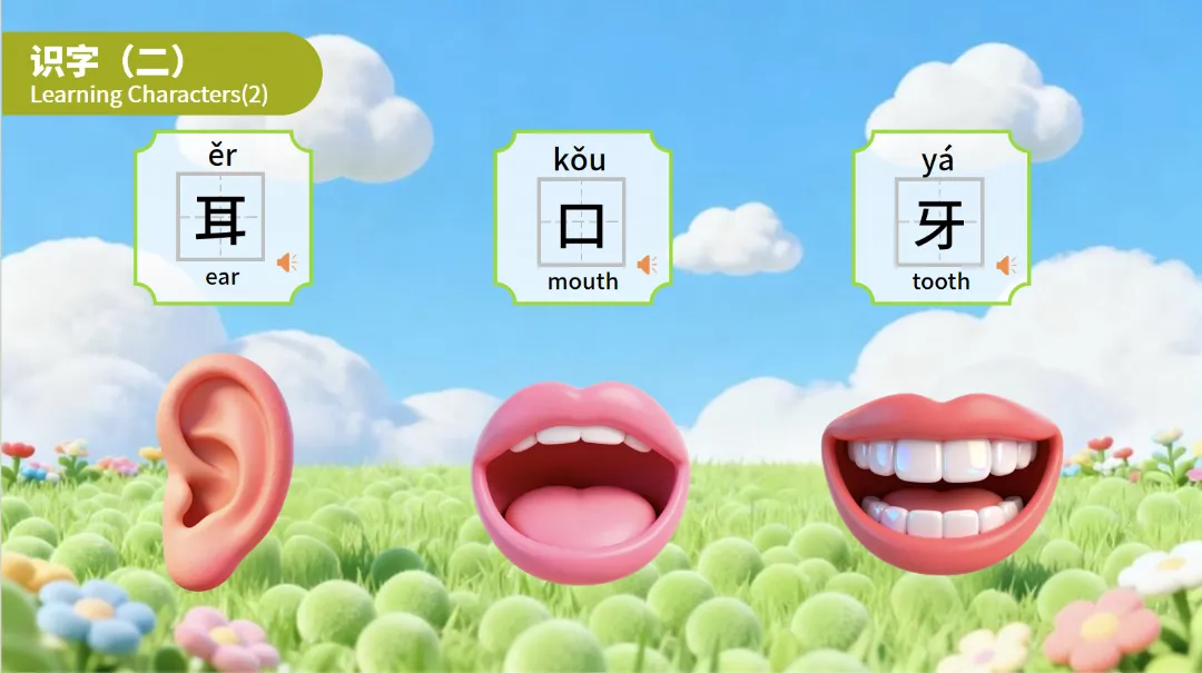 在教授“人”“头”“目”“耳”“口”“牙”等汉字时,课件通过精美的卡通图片与汉字相结合,每一个汉字都配有对应的拼音、英文翻译以及形象的插图。