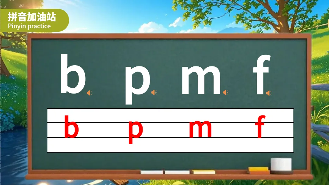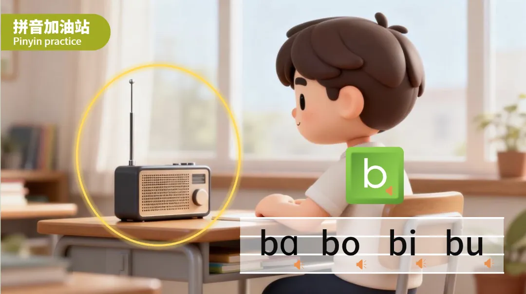 课件中的“拼音加油站”板块,专门针对拼音学习进行强化训练。以声母“b p m f”为例,通过生活中常见的收音机等实物图片引出拼音,让孩子们将拼音与实际生活紧密联系起来。