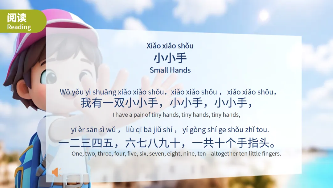 为了进一步拓展孩子们的阅读视野,让他们更好地领略汉语的魅力,课件还特别设置了阅读板块。如《小小手》这篇阅读内容,以简单易懂、朗朗上口的文字,描述了小朋友的小手,不仅让孩子们在阅读中巩固了所学的汉字和词汇,还能引导他们观察生活、表达自我。