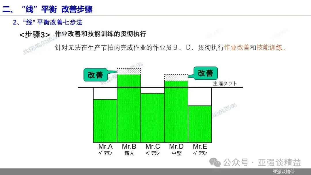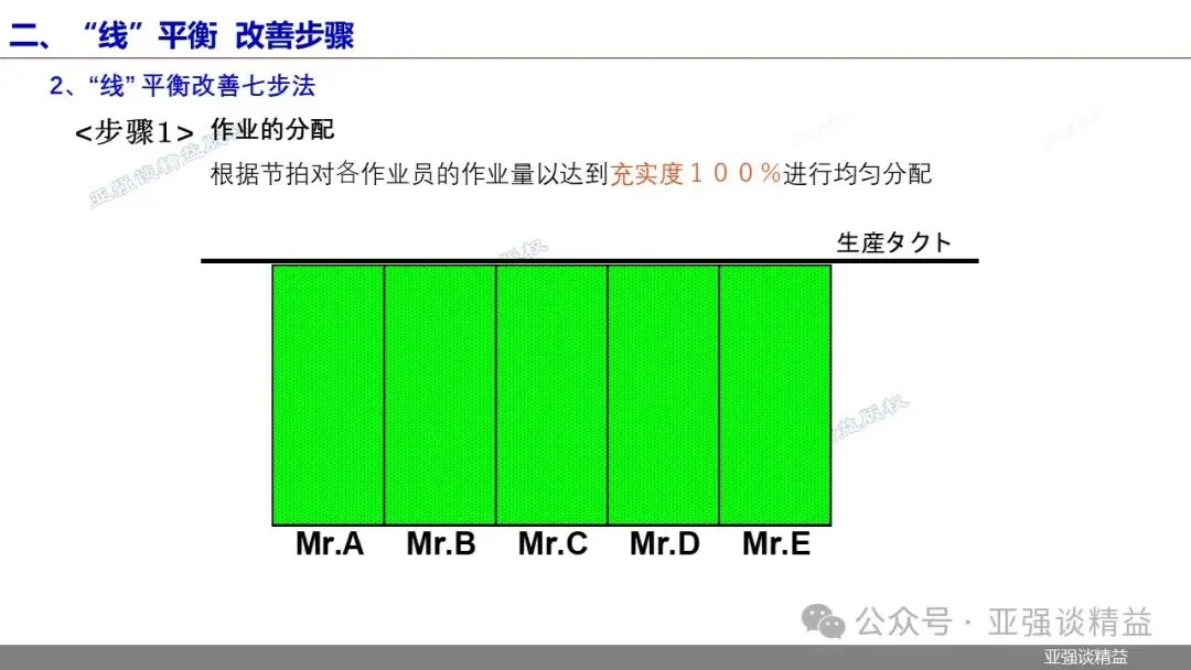 各道工序所需的时间处于平衡状态,作业人员的作业时间尽可能的保持一致,消除各道工序间的等待时间浪费,实现生产线平衡目标。