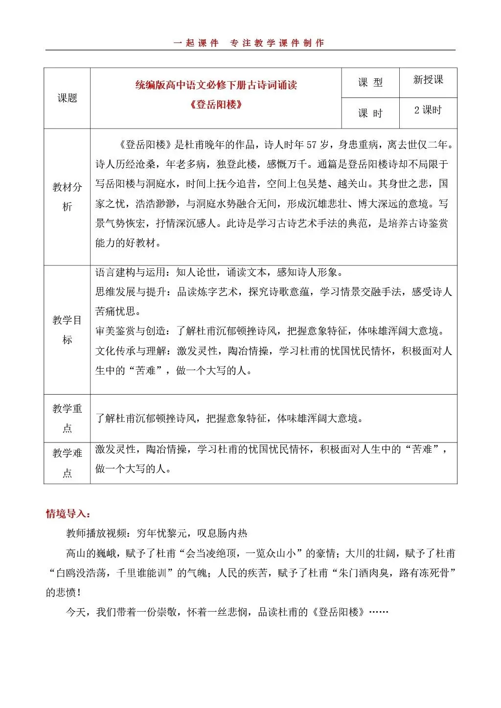 >【一起语文必修下】| 《登岳阳楼》:课件+教学设计