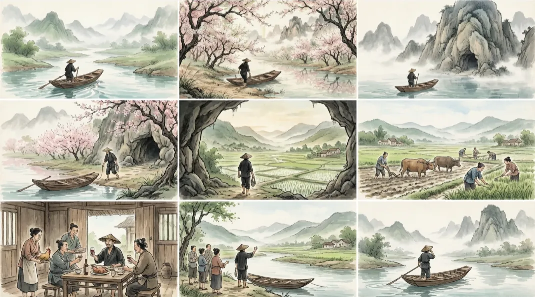 比如语文课要讲《桃花源记》,你需要一组展现"发现桃源-进入桃源-桃源生活-离开桃源"的插图。