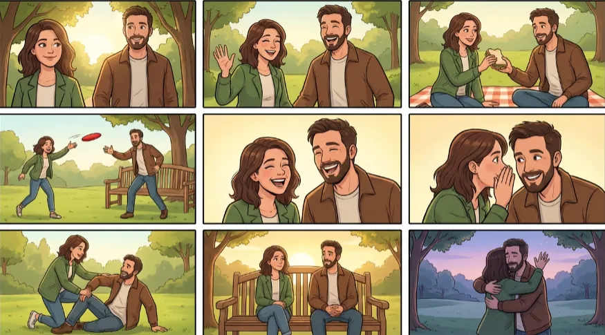 "基于这张'公园长椅'场景图,生成九宫格,展现一个完整的简短对话故事。每格画面聚焦人物中近景,角色外貌服装一致。通过人物表情、手势和背景细微变化,表现从'相遇'、'问候'、'分享食物'、'一起游戏'到'道别'的连贯过程。画面温馨,适合作为英语口语练习的视觉提示。"