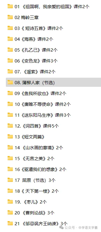 部编版九年级语文册下册课件,内容包含全册六个单元所有课文课件,以及写作,名著导读课件。还有部分情境任务,另外还有28个中考专题复习件课件。每篇课文基本3个课件甚至更多,风格不同都是从众多课件中精选出来的,目的是方便老师们备课参考。如购您买一册课件另外赠送“教师班主任常用资源包”有0.7g内容涵盖如“主题班会课件,各种计划总结、表格,黑板报,学生评语,励志教育等,另外还赠送课前5分钟励志教育小视频,语文课高效神器等目录如下: