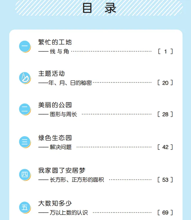 教材涵盖“数与代数”“图形与几何”“统计与概率”“综合与实践” 四大领域,具体包括:线与角、年・月・日的秘密、图形与周长、解决问题、长方形和正方形的面积、万以上数的认识、度量衡的故事、条形统计图、植树问题、多位数除以两位数、总复习共 11 个单元(含主题活动和智慧广场)。