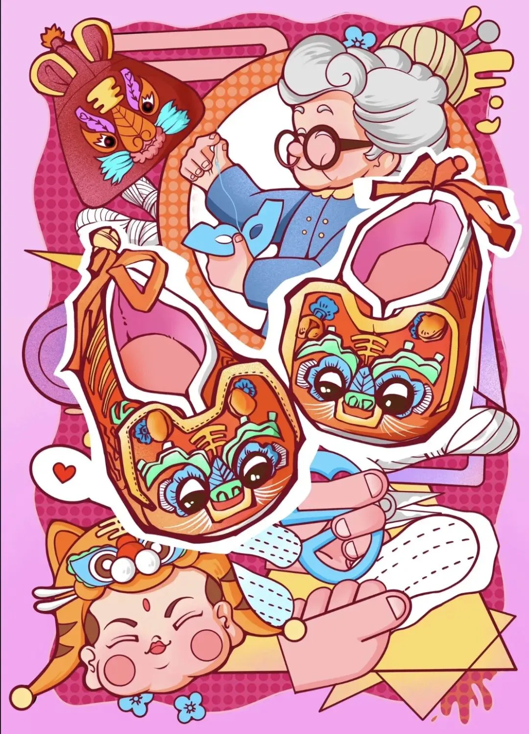 - 难点:给虎头鞋加上漂亮的花纹、颜色搭配,让鞋子既威风又萌萌哒。