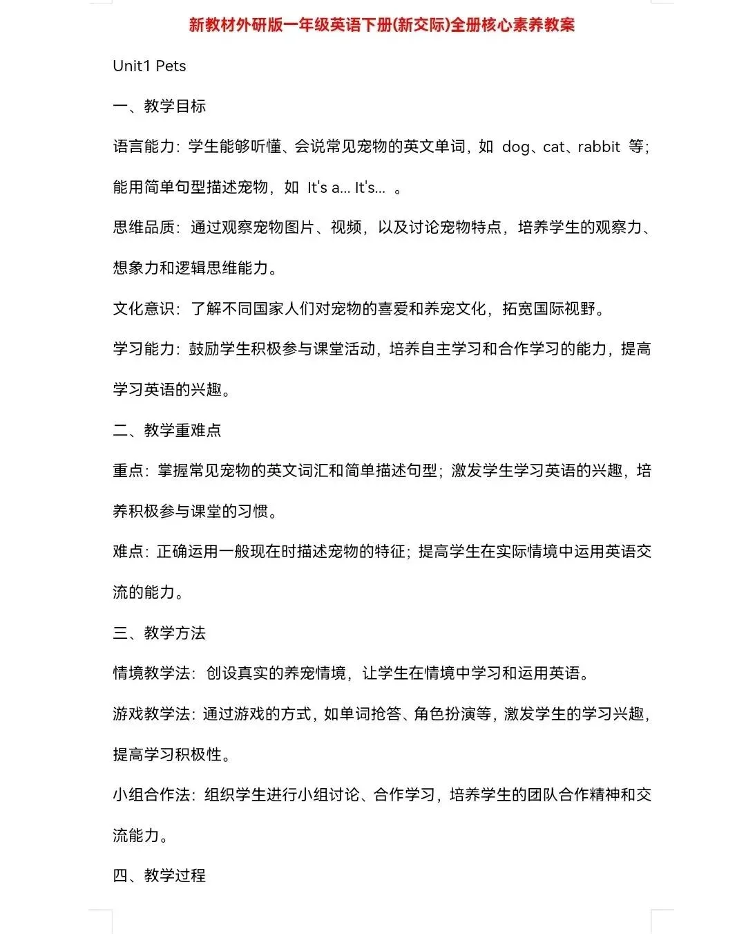 2026春新交际一年级英语下册核心教案设计(免费word版)