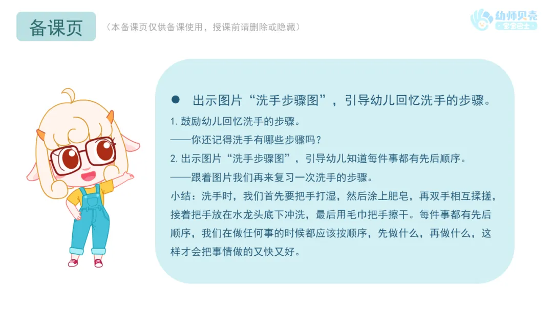 l如果有条件,教师可以将图片打印下来,活动结束后,将洗手的步骤图与吃点心顺序图张贴在教室的墙上。