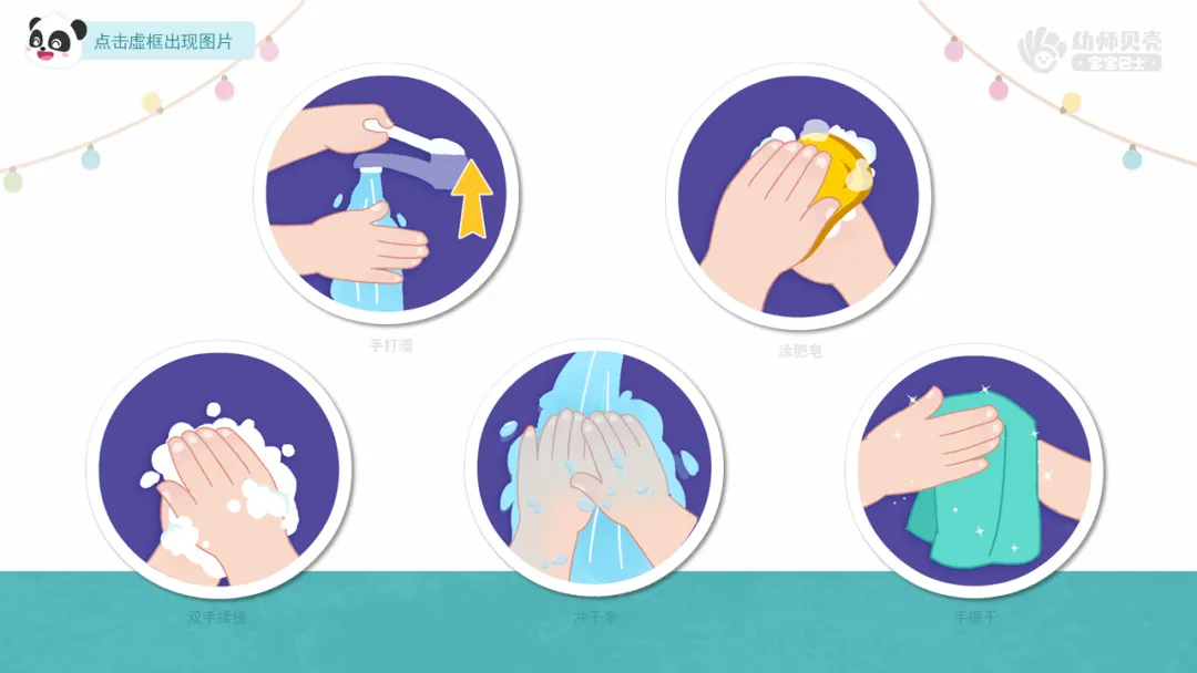 2.出示图片“洗手步骤图”,复习洗手步骤。