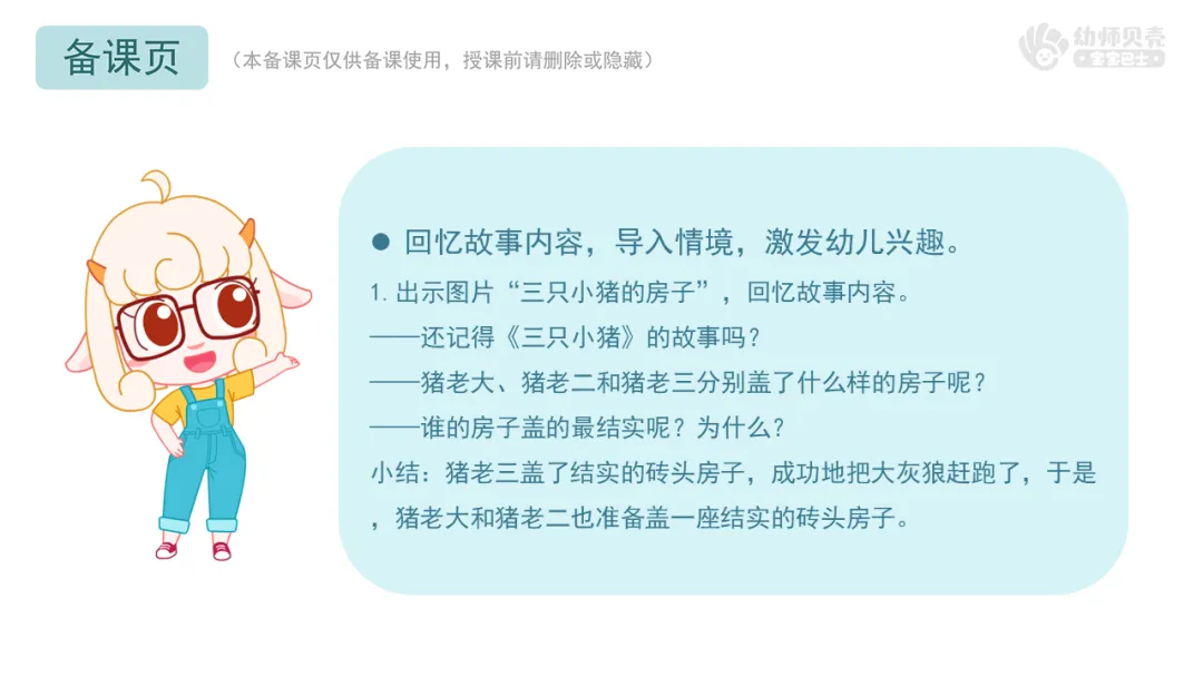 ——猪老三喜欢一边盖房子一边听着音乐,不一会儿房子就盖好了,我们也一起来听听音乐想一想怎么盖房子吧。