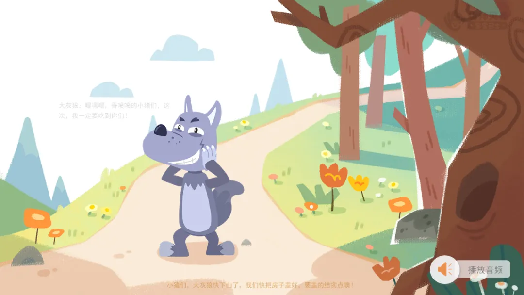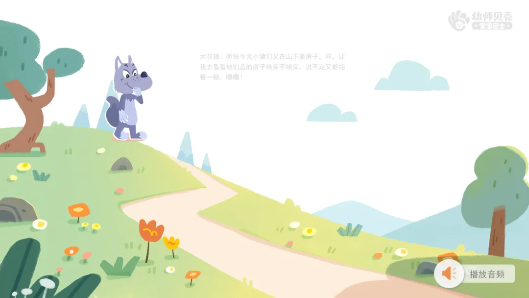 1.播放音频及图片“快下山的大灰狼”,通过情境激发幼儿继续盖房子。