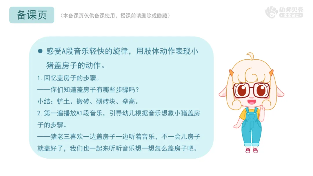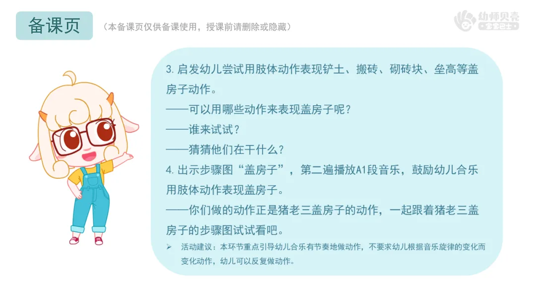 l重点:能跟随音乐的节奏大胆表现小猪盖房子时铲土、搬砖、砌砖块、垒高等动作。