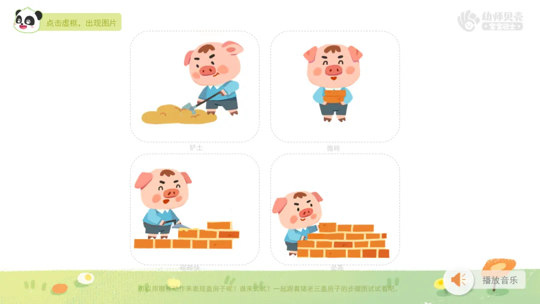 ——也有一些小猪盖房子好像有点困难,我们一起来帮助有困难的小猪。这次,小猪们要观察步骤图,出现哪张步骤图,做哪个步骤的动作。