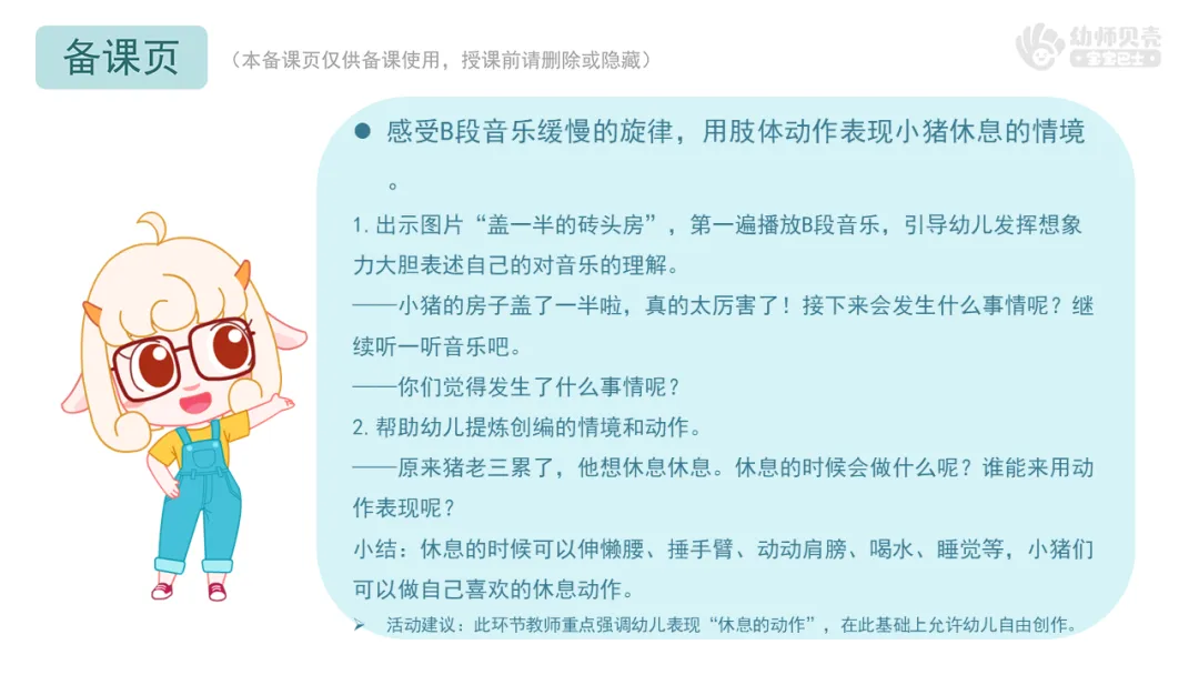 l感受B段音乐缓慢的旋律,用肢体动作表现小猪休息的情境。