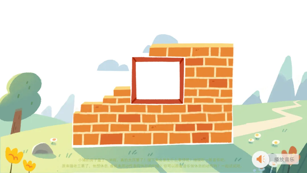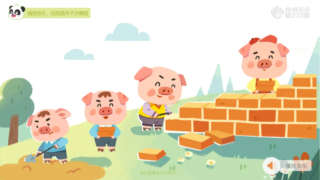 ——小猪的房子盖了一半啦,真的太厉害了!接下来会发生什么事情呢?继续听一听音乐吧。