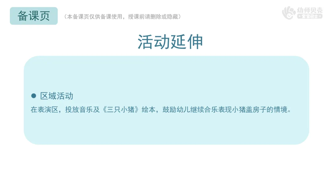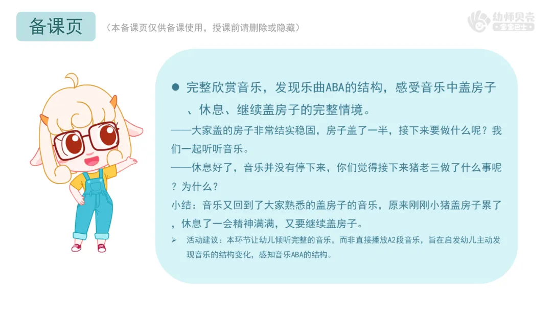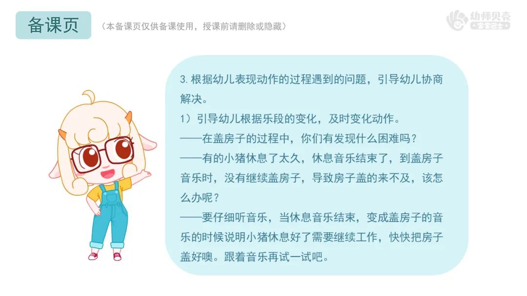 ——要仔细听音乐,当休息音乐结束,变成盖房子的音乐的时候说明小猪休息好了需要继续工作,快快把房子盖好噢。跟着音乐再试一试吧。