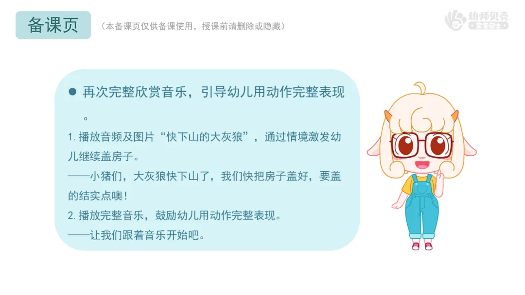 ——大家盖的房子非常结实稳固,房子盖了一半,接下来要做什么呢?我们一起听听音乐。