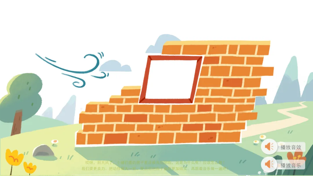 2)播放音频及图片“刮大风”,通过情境激发幼儿大胆表现小猪盖房子动作,加强动作的表现力。