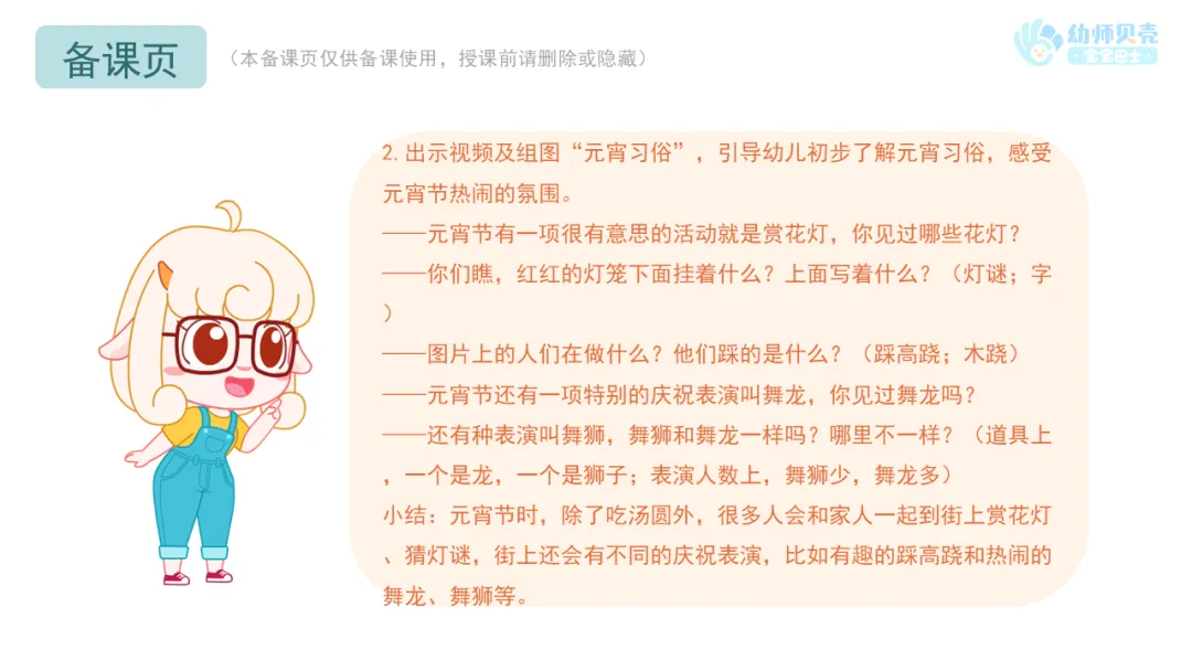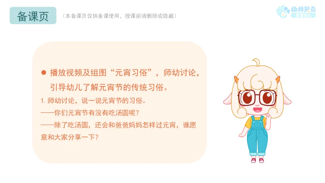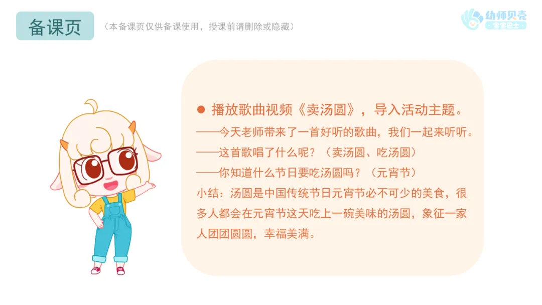 l课件准备:《卖汤圆》歌曲视频;《元宵节》动画视频;“元宵习俗”组图。