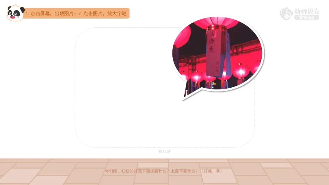 ——你们瞧,红红的灯笼下面挂着什么?上面写着什么?(灯谜;字)