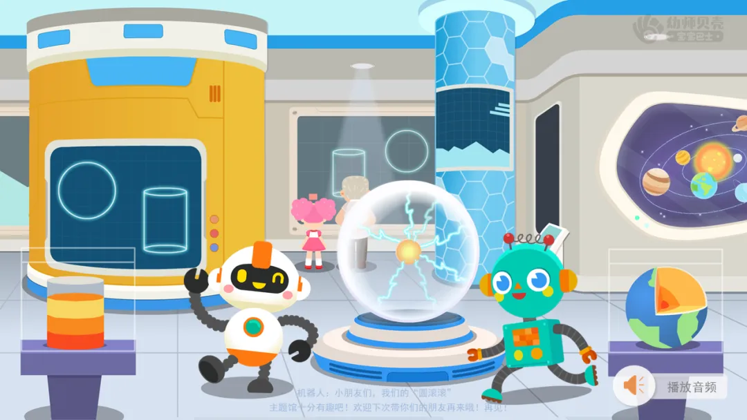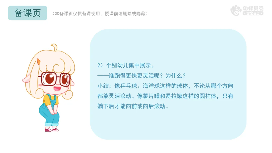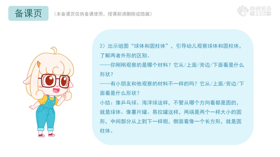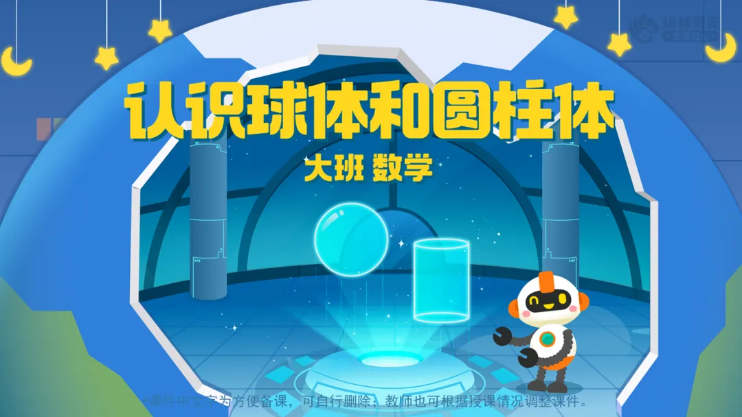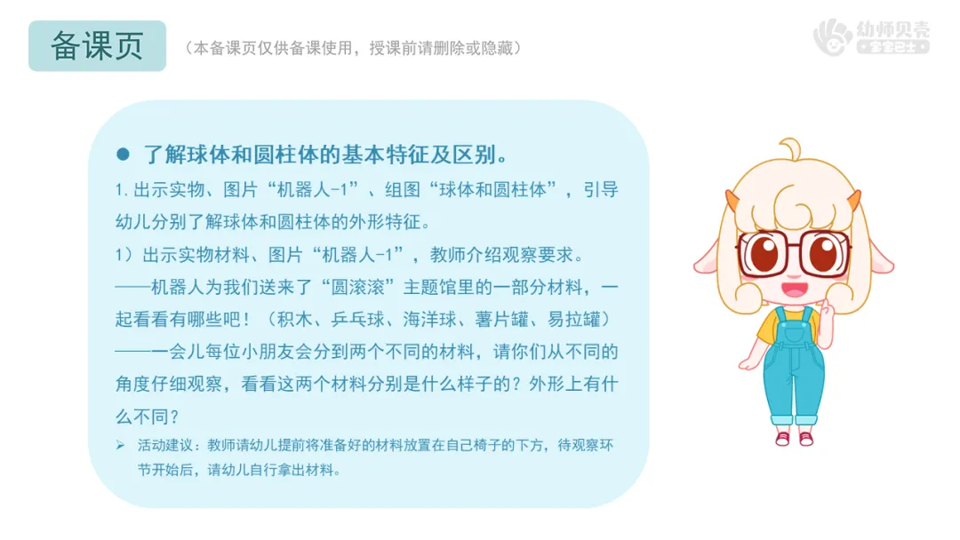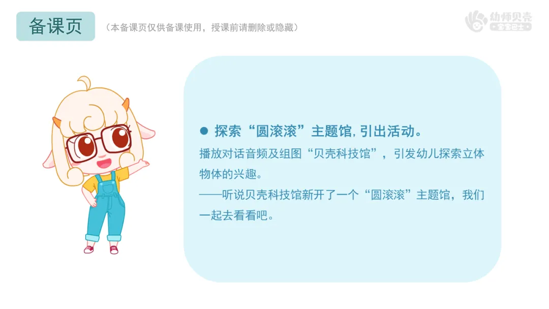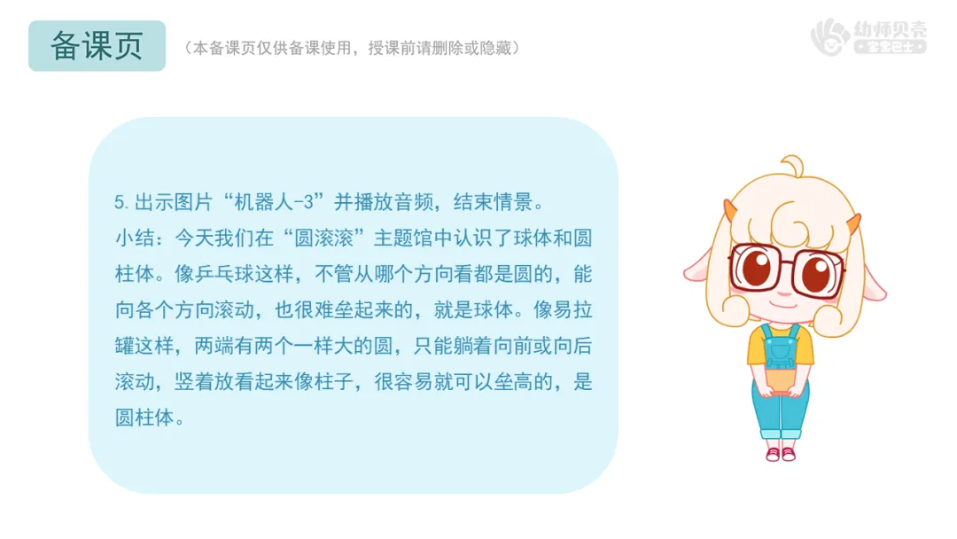 l课件准备:“贝壳科技馆”音频及图片;“球体和圆柱体”组图;“机器人”组图;“球体及圆柱体”组图;“球体及圆柱体”动图。
