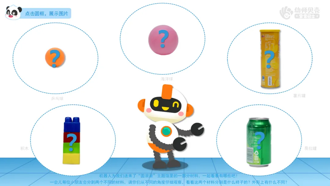 ——机器人为我们送来了“圆滚滚”主题馆里的一部分材料,一起看看有哪些吧!(积木、乒乓球、海洋球、薯片罐、易拉罐)