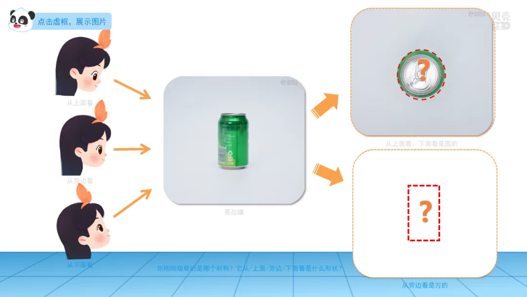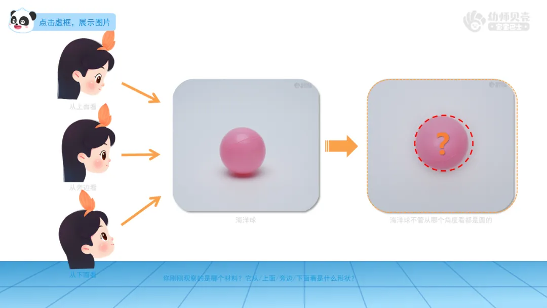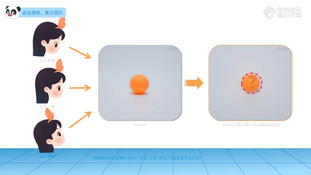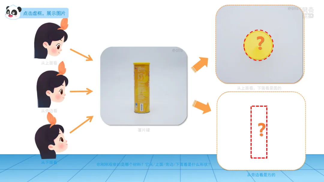 ——有小朋友和他观察的材料不一样的吗?它从/上面/旁边/下面看是什么形状?