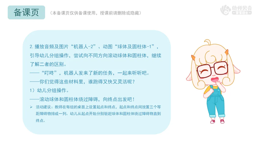 2.播放音频及图片“机器人-2”,动图“球体及圆柱体-1”,引导幼儿分组操作,尝试向不同方向滚动球体和圆柱体,继续了解二者的区别。
