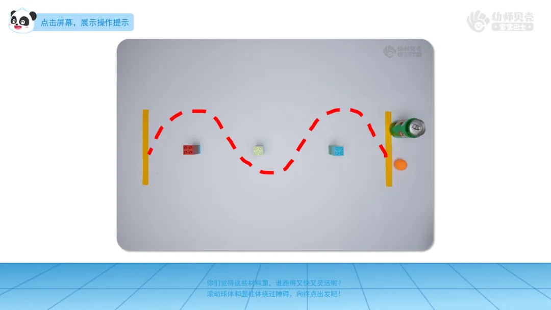Ø活动建议:教师在每组的桌面上设置起点和终点,起点和终点间放置三个等距障碍物排成一列。幼儿从起点开始分别驱赶球体和圆柱体绕过障碍物直到终点。