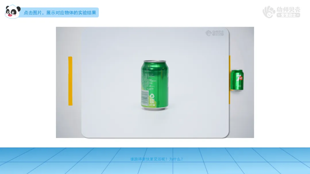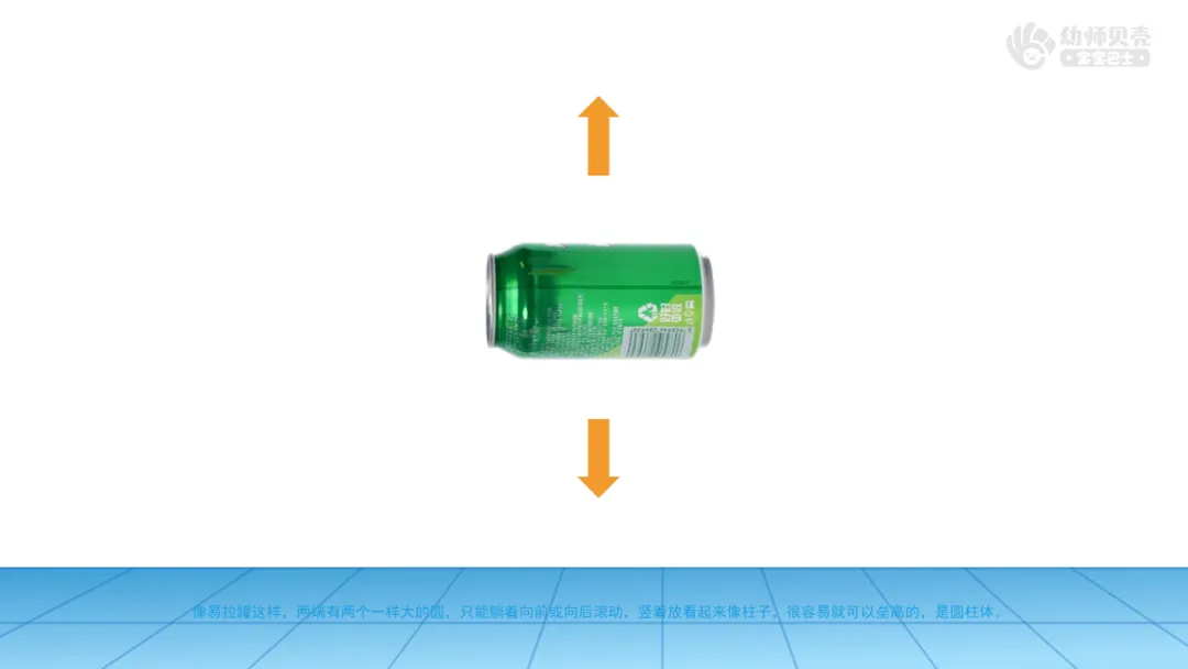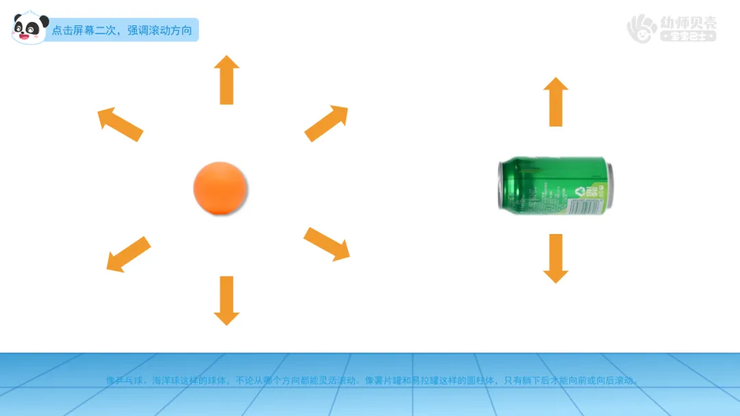 小结:像乒乓球、海洋球这样的球体,不论从哪个方向都能灵活滚动。像薯片罐和易拉罐这样的圆柱体,只有躺下后才能向前或向后滚动。