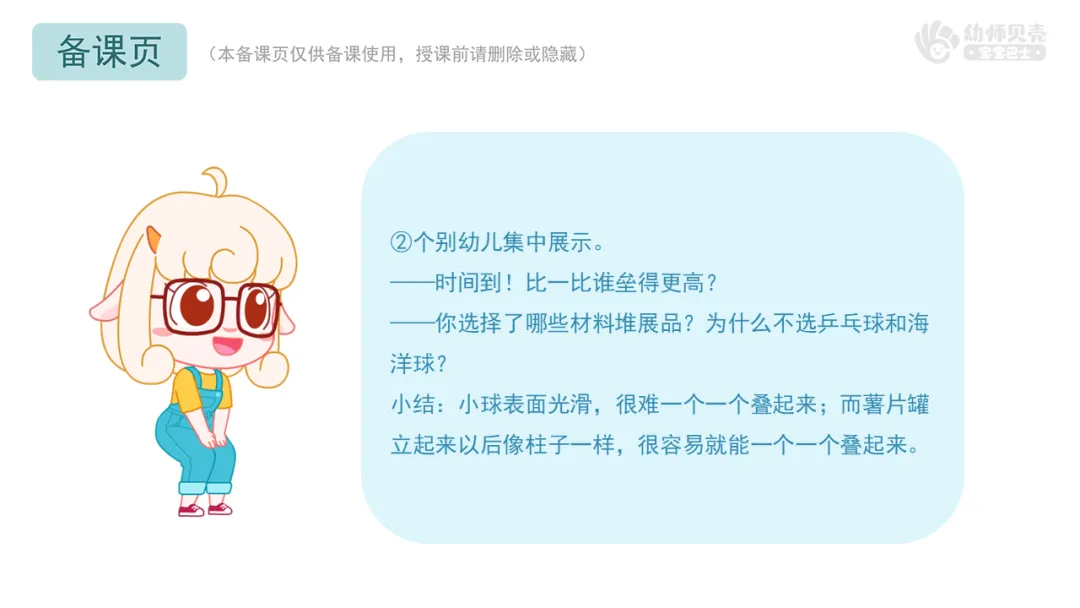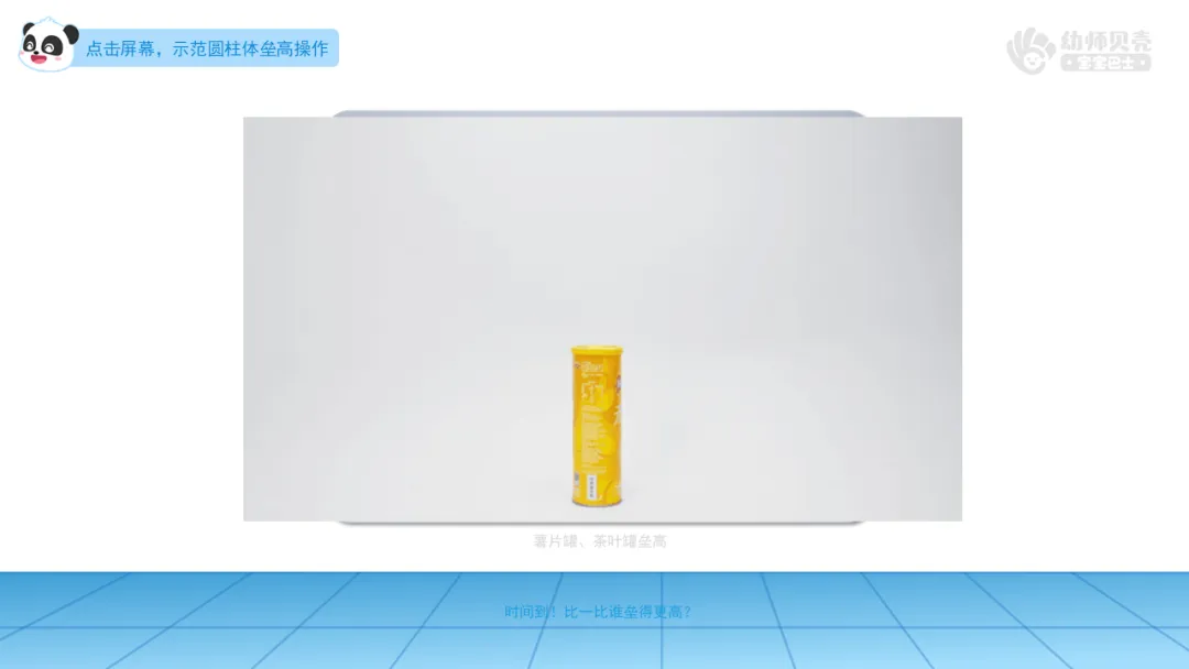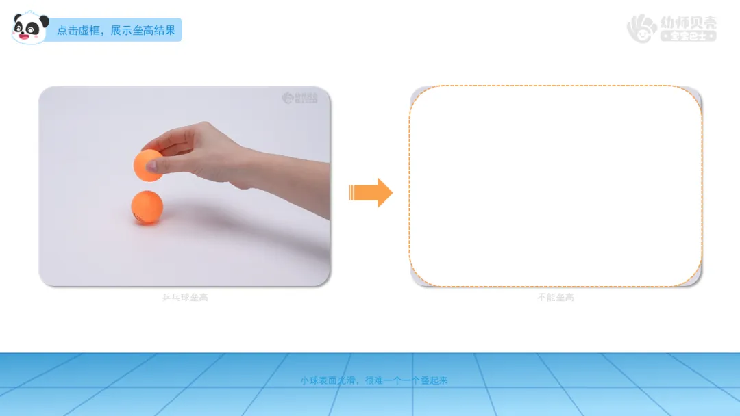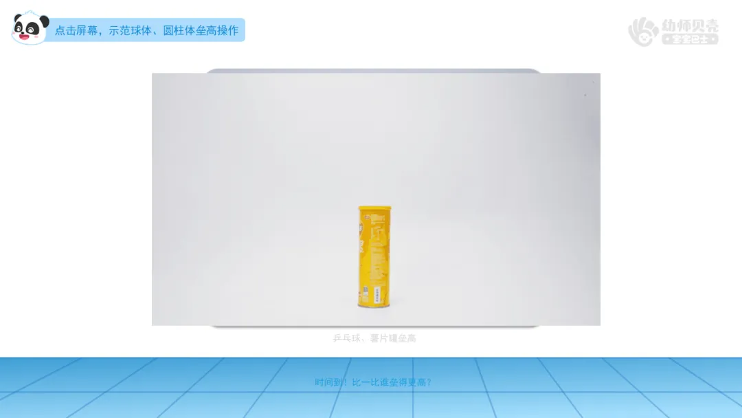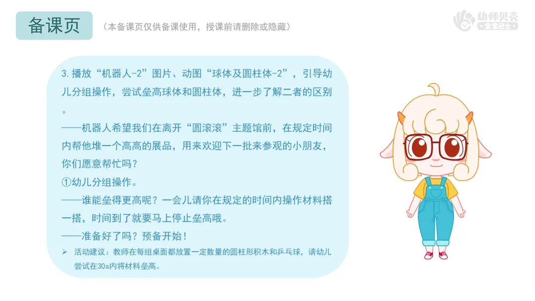 3.播放“机器人-2”图片、动图“球体及圆柱体-2”,引导幼儿分组操作,尝试垒高球体和圆柱体,进一步了解二者的区别。
