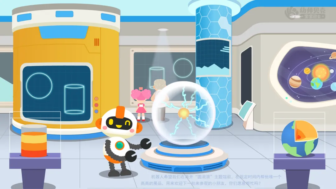 ——机器人希望我们在离开“圆滚滚”主题馆前,在规定时间内帮他堆一个高高的展品,用来欢迎下一批来参观的小朋友,你们愿意帮忙吗?