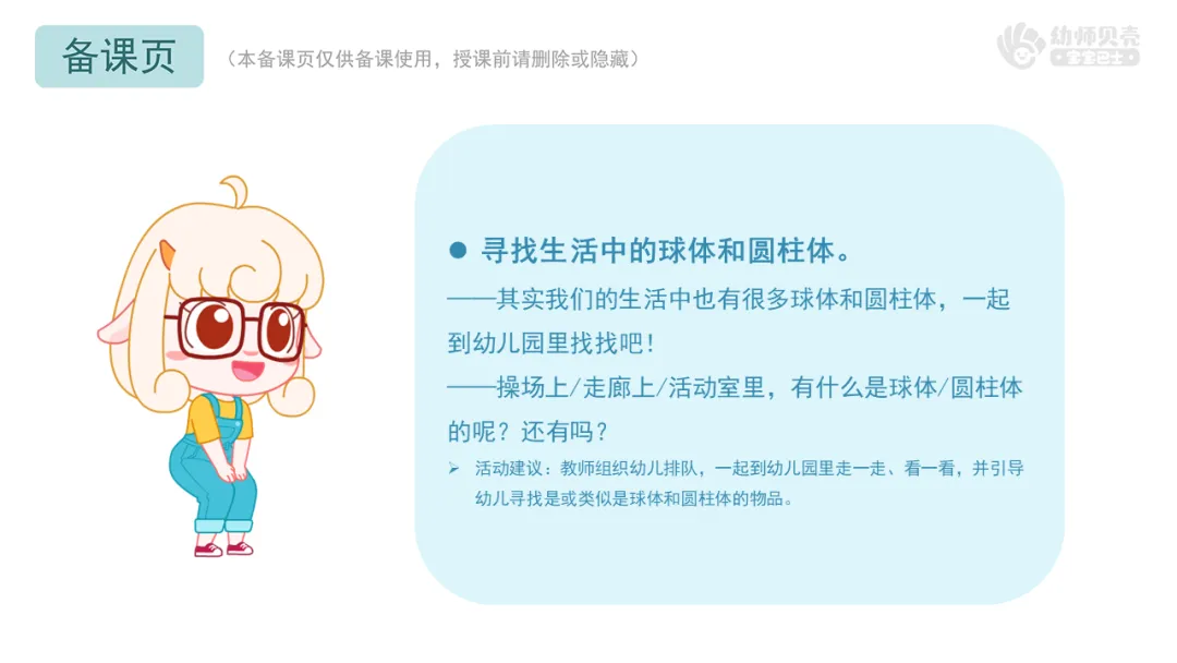 ——操场上/走廊上/活动室里,有什么是球体/圆柱体的呢?还有吗?