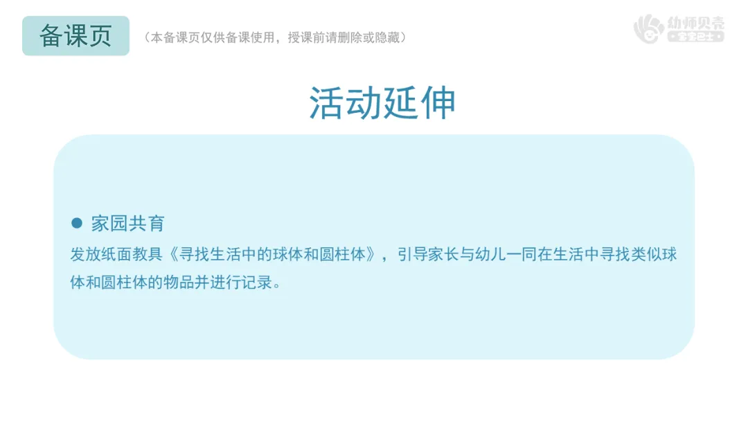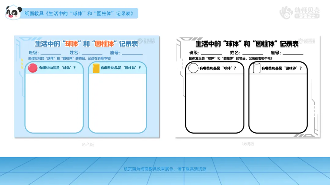 发放纸面教具《寻找生活中的球体和圆柱体》,引导家长与幼儿一同在生活中寻找类似球体和圆柱体的物品并进行记录。